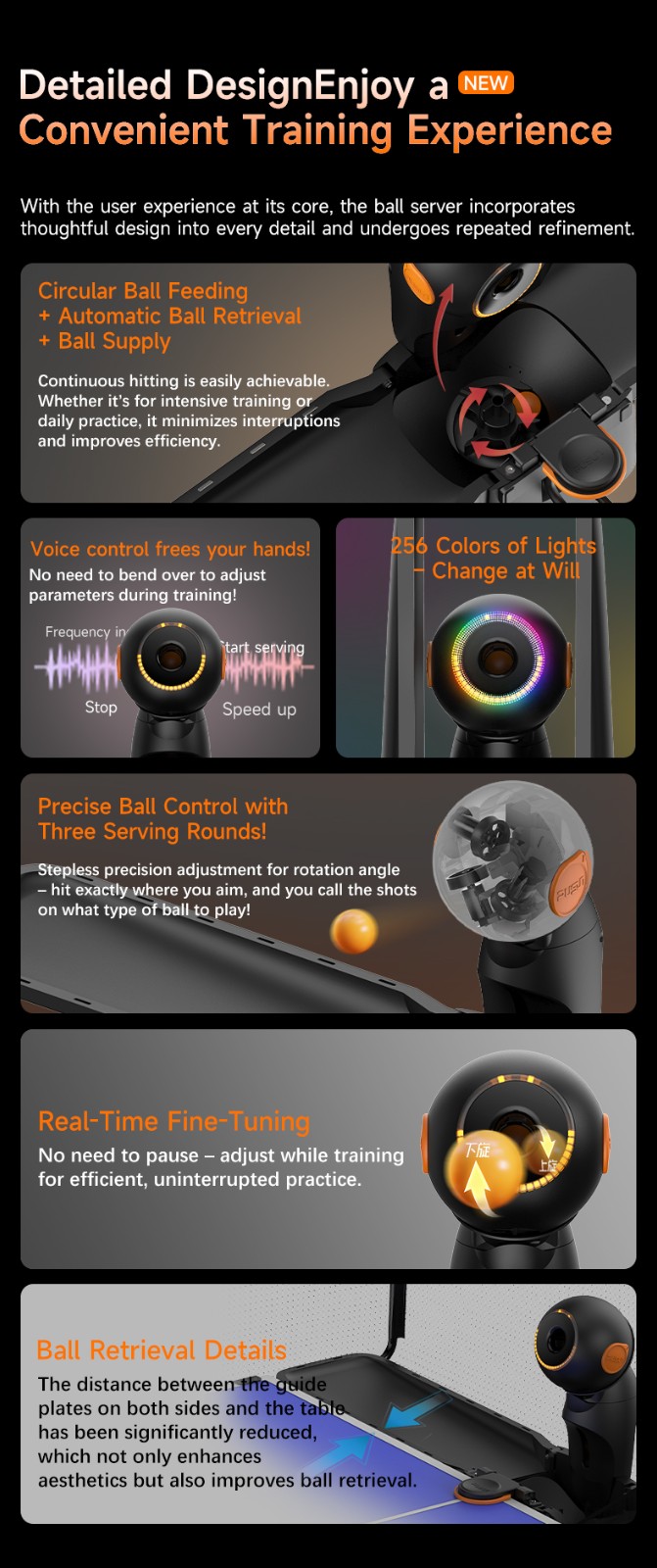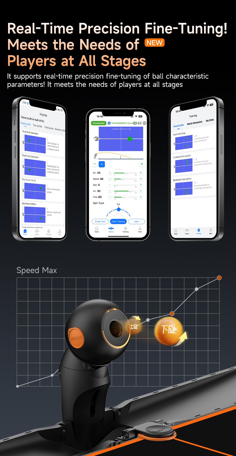 Fixed Placement Serve,Receive of Serve,Sidespin Serve,Topspin/Backspin Serve,Random Placement Serve,Combination Serve with Variations in Speed, Frequency, Spin, and Placement, Self-programming, default ball settings,speed adjustment, frequency adjustment.