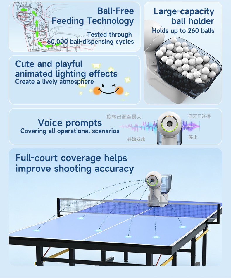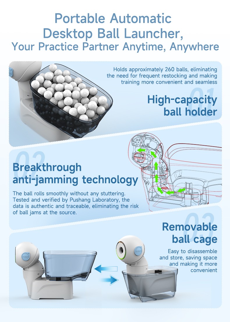 The 260-ball capacity hopper with an efficient feeding system minimizes interruptions, keeping you focused on footwork and stroke rhythm for highly productive training.