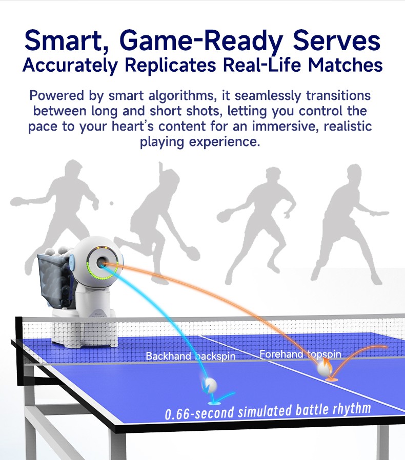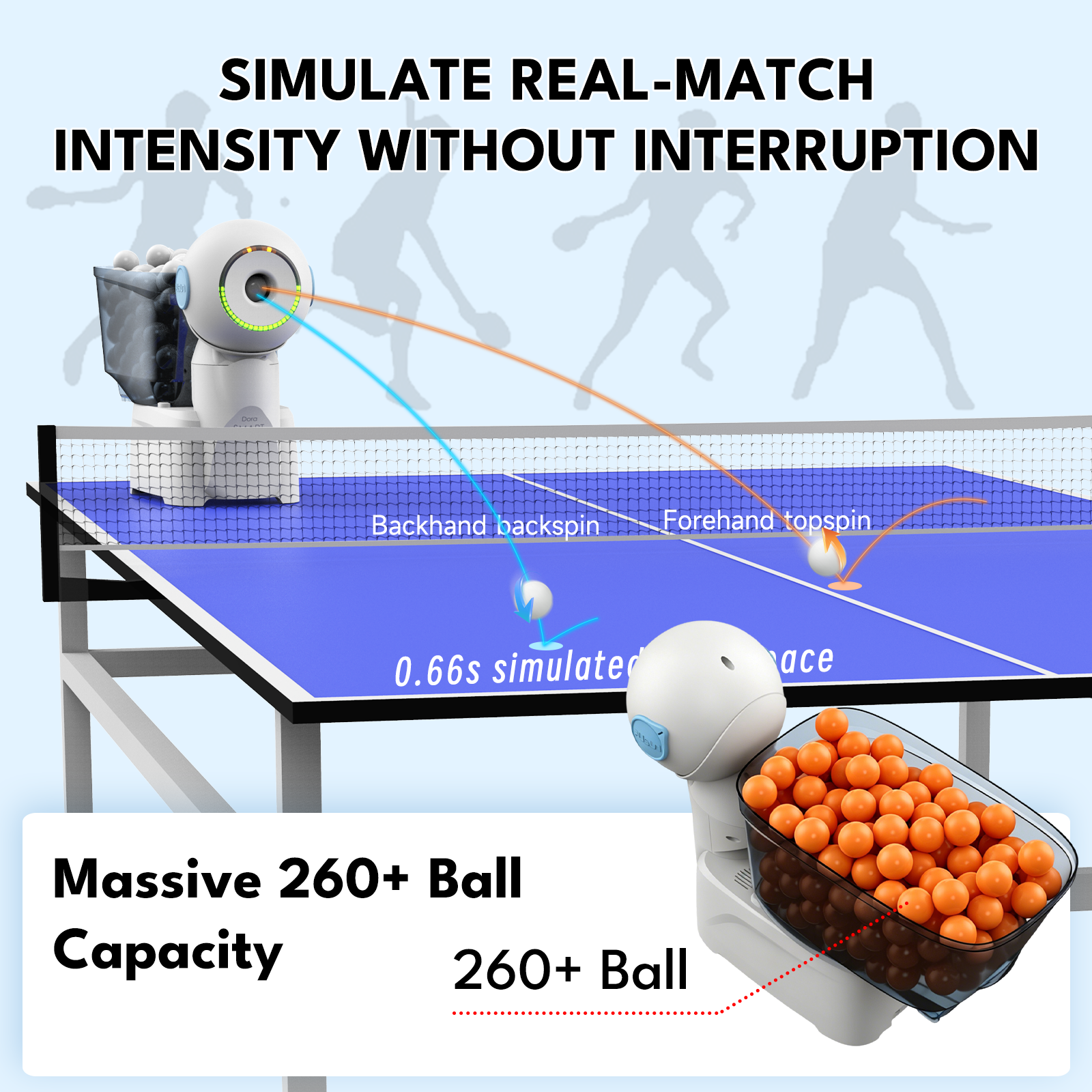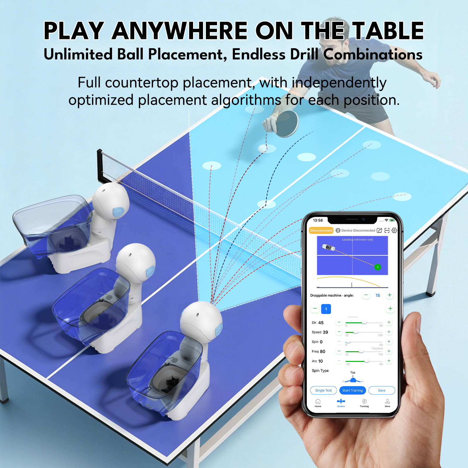 The advanced 3-wheel drive system delivers topspin, backspin, sidespin, and no-spin balls without rotating the head. Seamless spin switching mimics the rhythm of a real opponent for more authentic training.