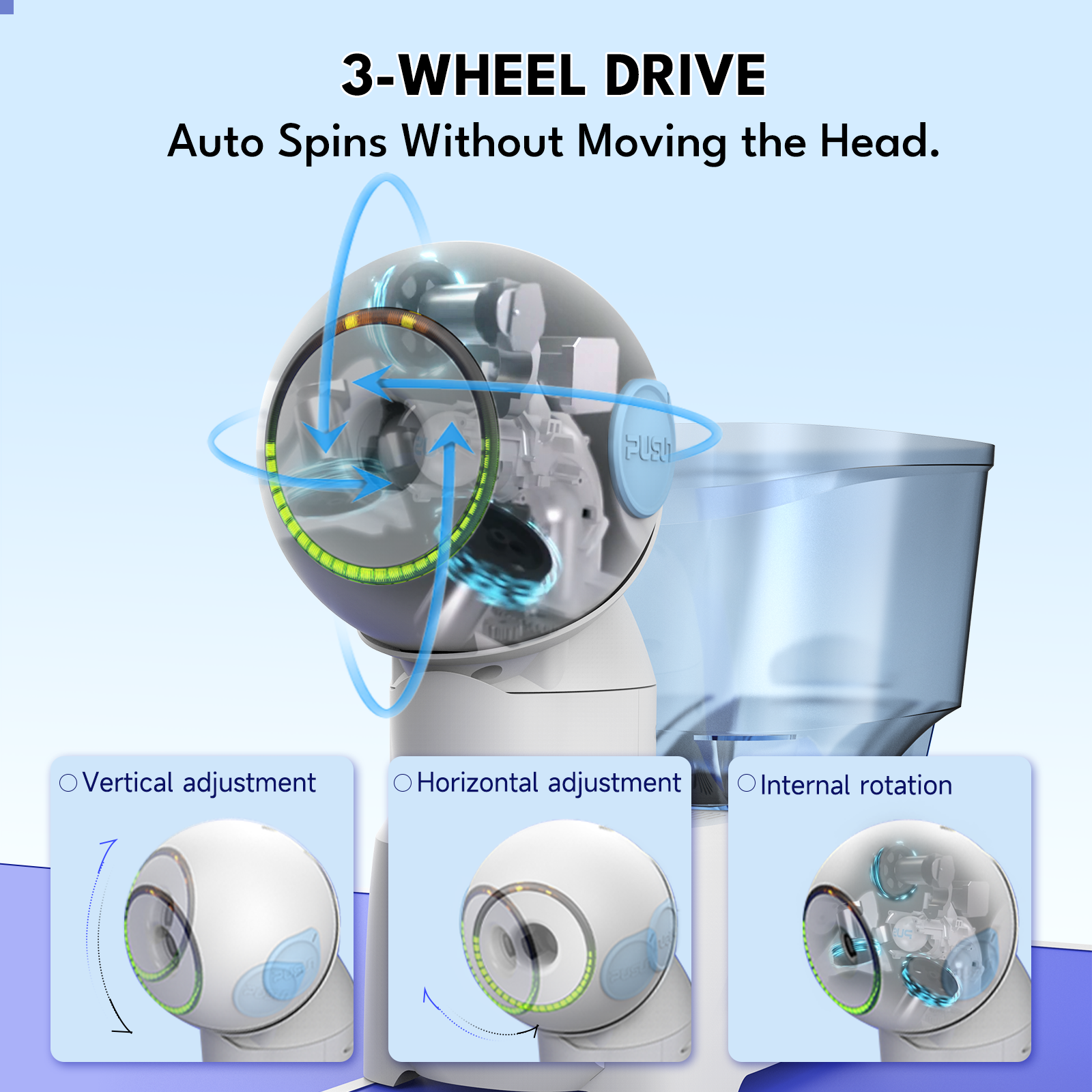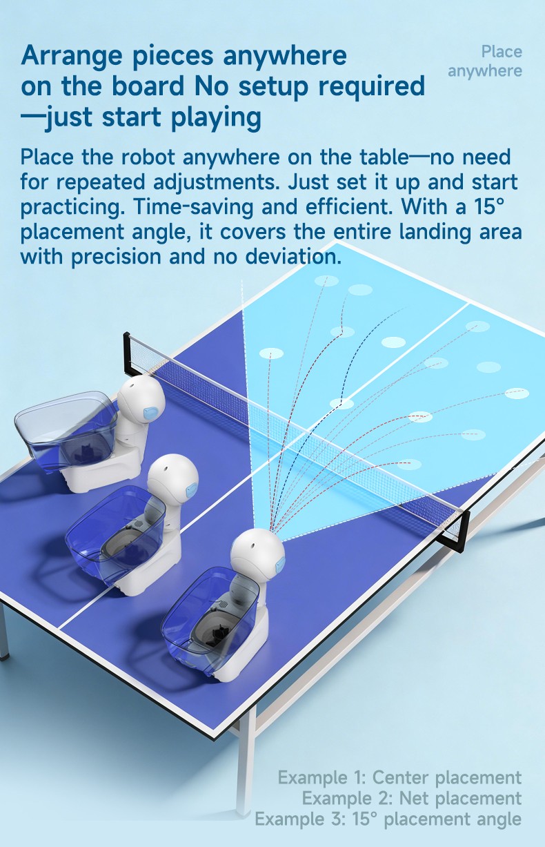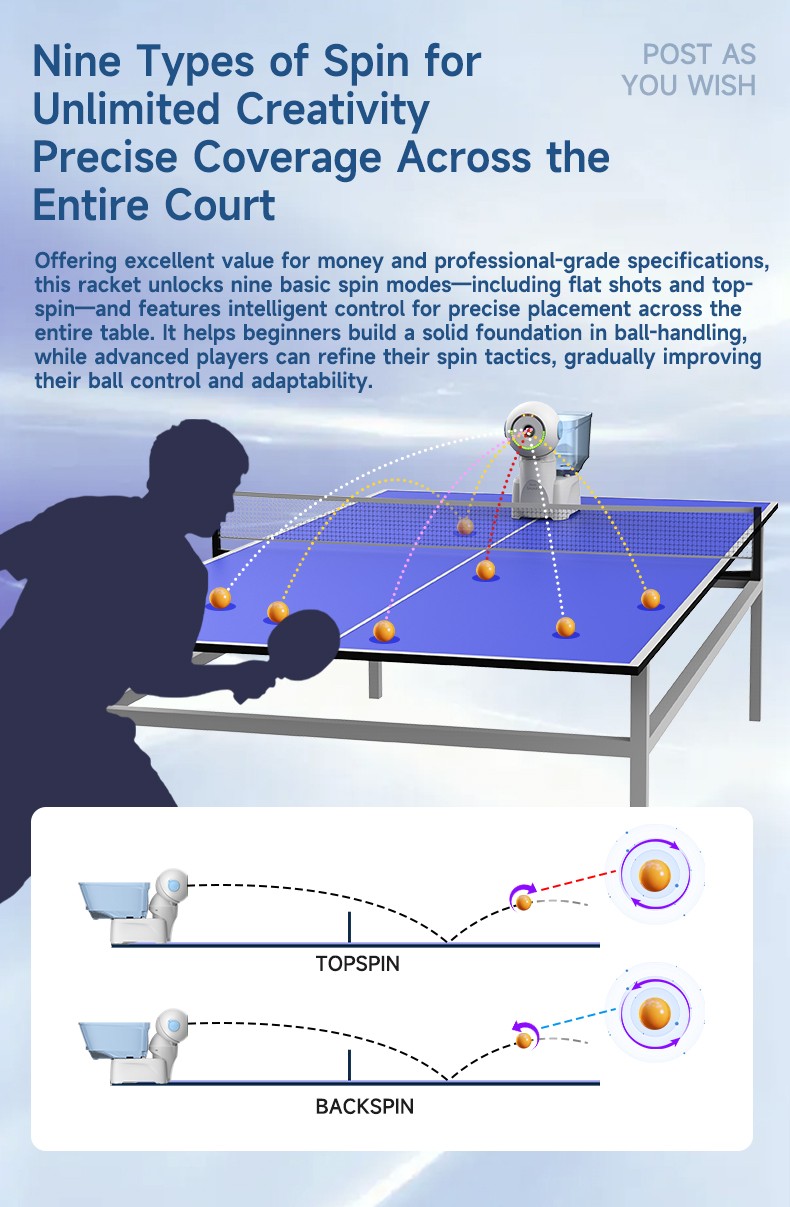 The advanced 3-wheel drive system delivers topspin, backspin, sidespin, and no-spin balls without rotating the head. Seamless spin switching mimics the rhythm of a real opponent for more authentic training.